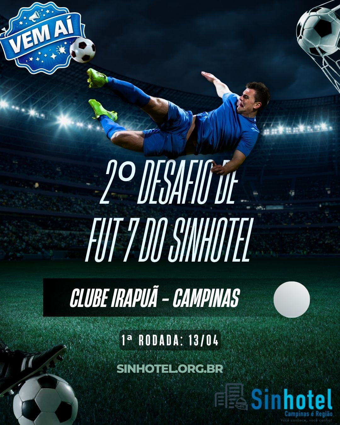 Começa nesta segunda-feira, 13, a segunda edição do Campeonato de Fut 7 do Sinhotel Campinas, reunindo equipes formadas por trabalhadores associados ao sindicato, em uma manhã de disputas que promete equilíbrio e alto nível técnico. Os jogos serão realizados no Clube Irapuã, em Sousas, a partir das 8h30.